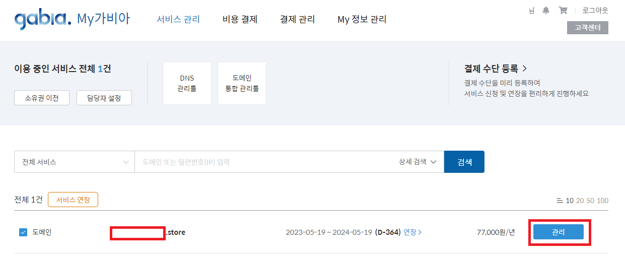가비아에서 구매한 도메인이기 때문에 가비아-My가비아-서비스 관리로 이동한다.
