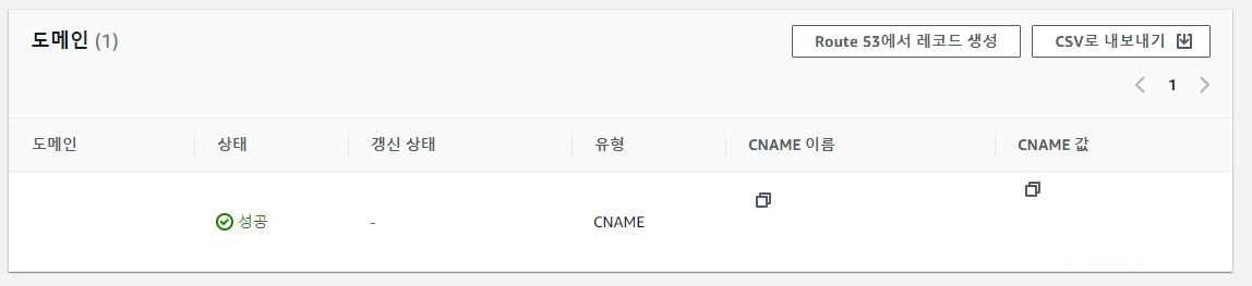 AWS Certificate Manager(ACM)에서 인증서 상태가 검증 대기 중에서 발급됨으로 바뀌면 정상적으로 인증서가 발급되었다.