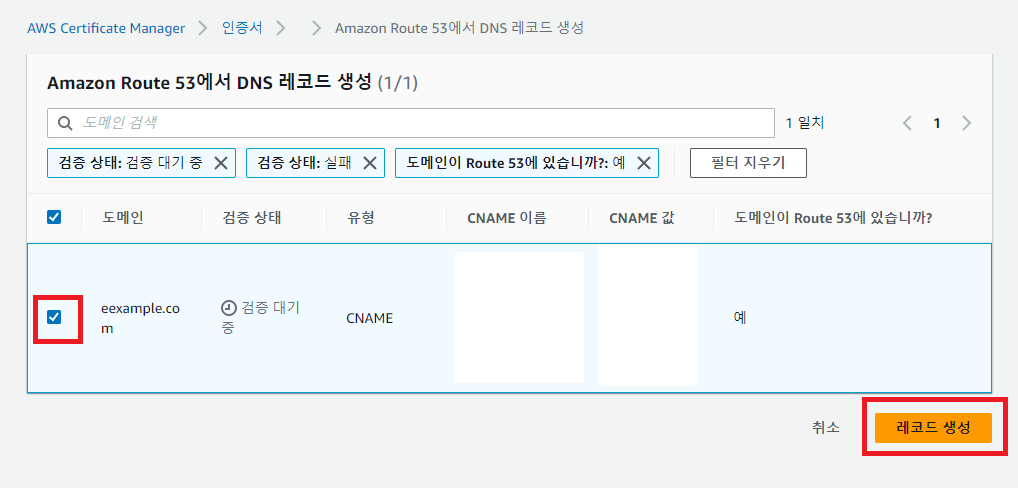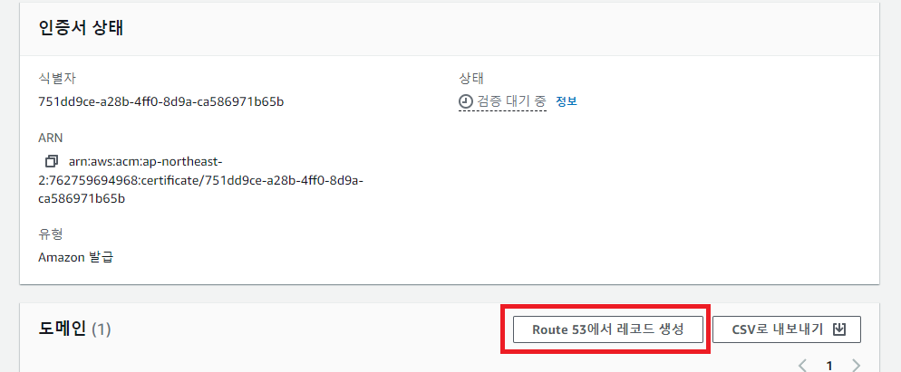 글 상단 1. AWS Certificate Manager(ACM) 설명에 따라 인증서를 요청하고 Certificate Manager에서 인증서를 나열하고 인증서 ID로 이동해 Route53에서 레코드 생성을 선택한다.