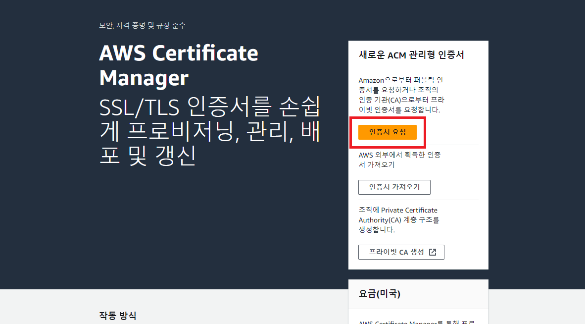 AWS Certificate Manager(ACM) 접속 후 로그인, 인증서 요청으로 이동한다.