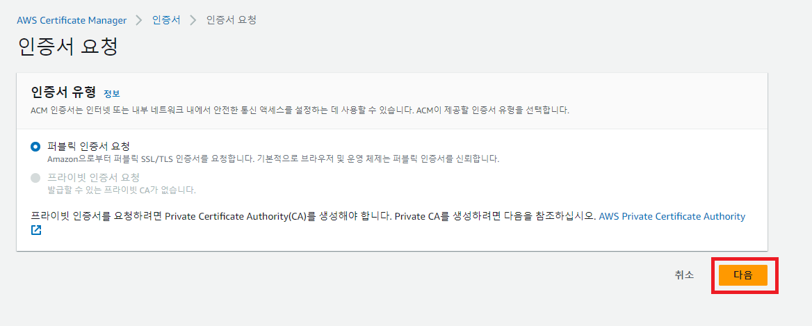 퍼블릭 인증서 요청을 한다.