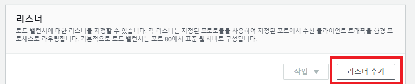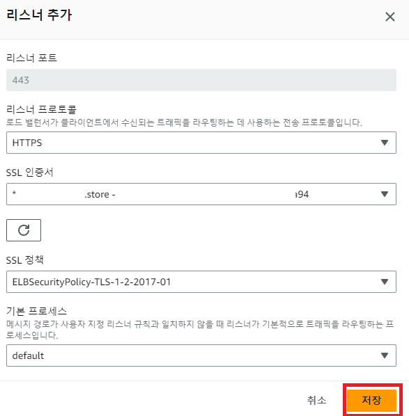 리스너 포트는 443, 프로토콜은 HTTPS, SSL 인증서는 AWS Certificate Manager(ACM) 발급받은 인증서 선택, SSL 정책 선택 후 저장한다.