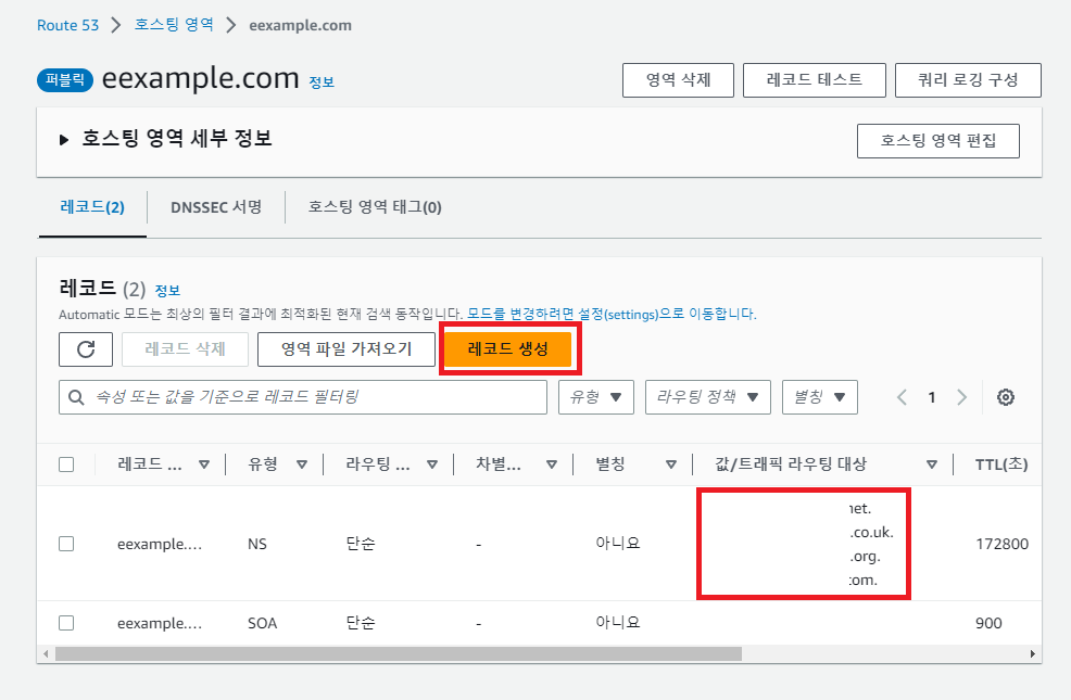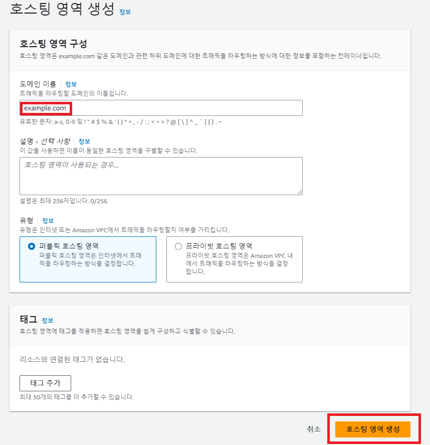 자신의 도메인을 입력 후에 호스팅 영역을 생성한다.