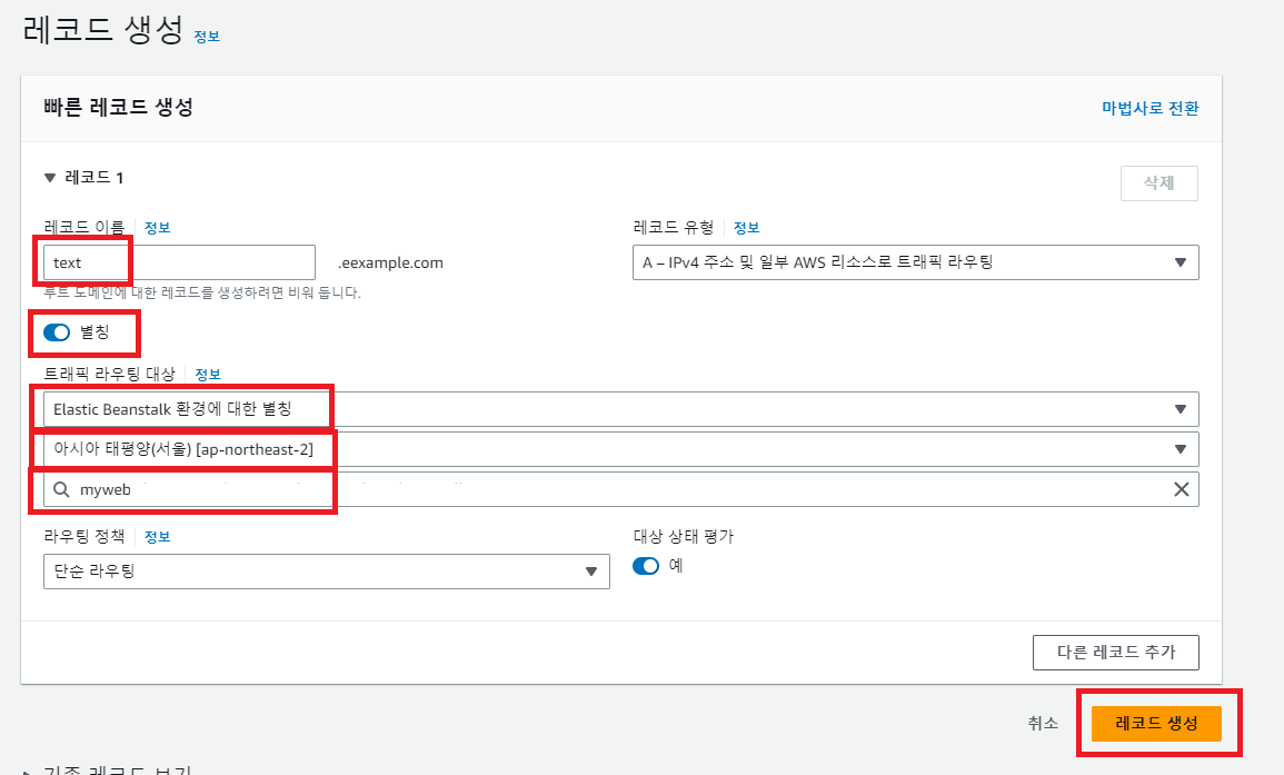 Elastic Beanstalk 환경에 대한 별칭, 아시아 태평양 서울, Elastic Beanstalk 도메인 주소를 선택하고 레코드 생성한다.