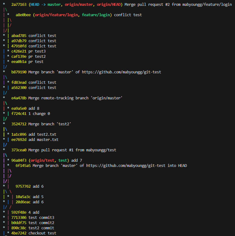 (master, test branch 존재할 때 master에서 test를 병합하는 것과 test에서 master를 병합하는 것은 다르다)