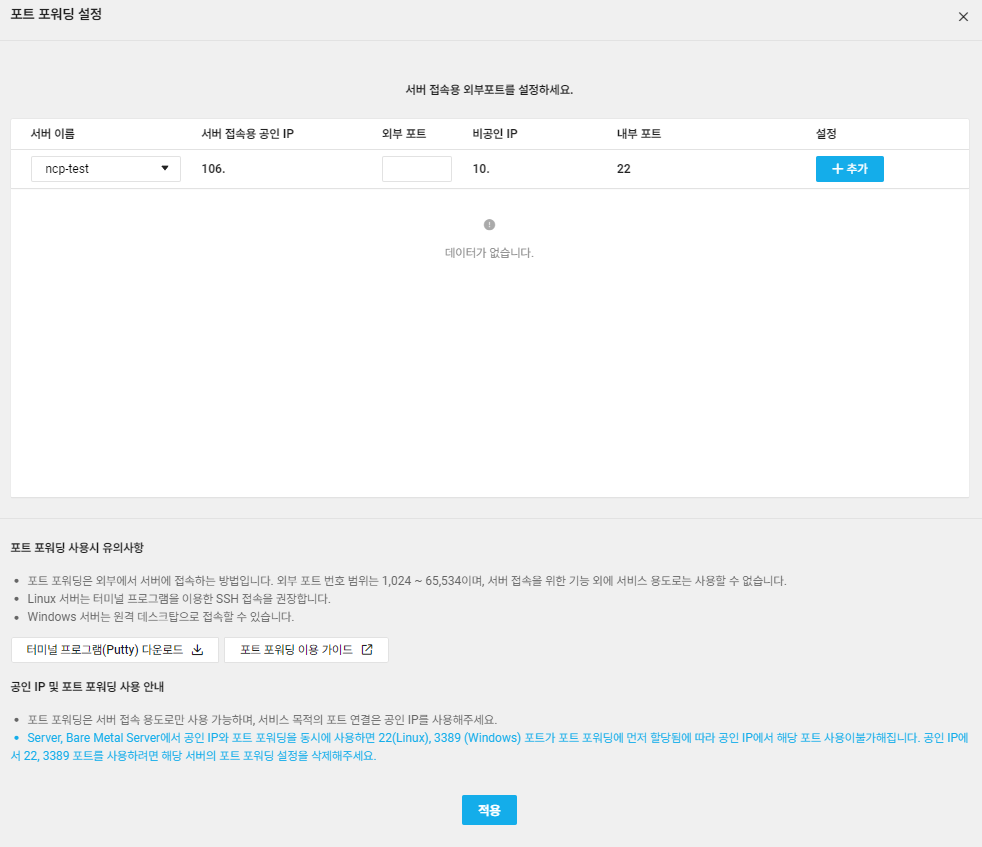 외부 포트 설정 후 추가 -> 적용