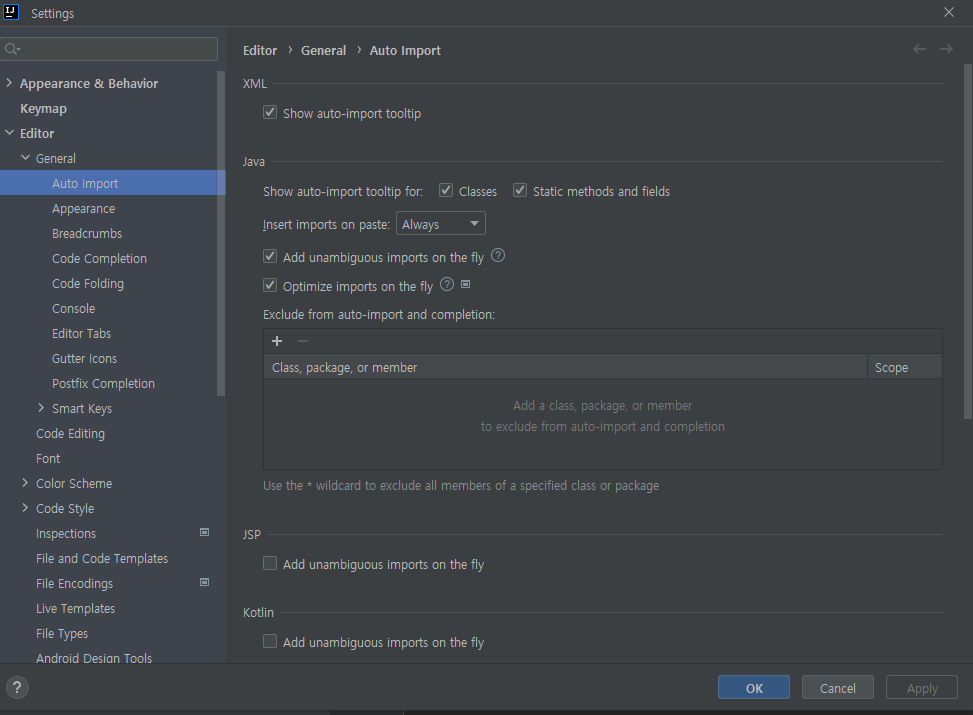 코드에 필요한 import를 자동으로 삽입, 삭제해 주는 옵션