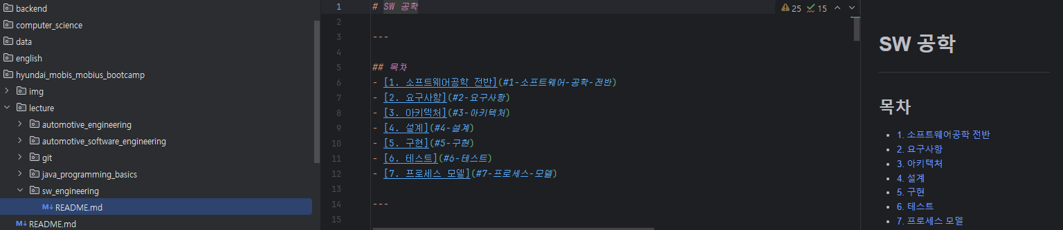 기존에는 공부한 것들을 마크다운 형식으로 정리하다 보니 모비우스 부트캠프 강의들도 아래와 같이 정리하고 있다.